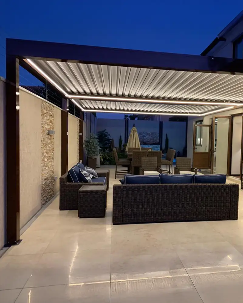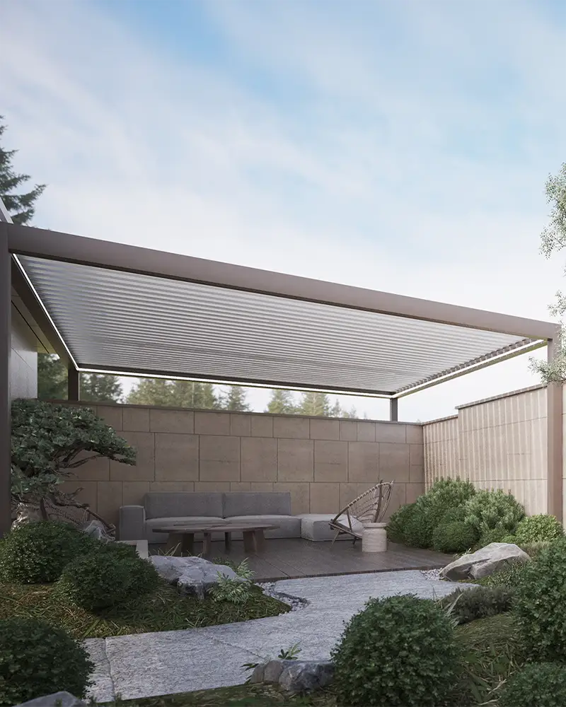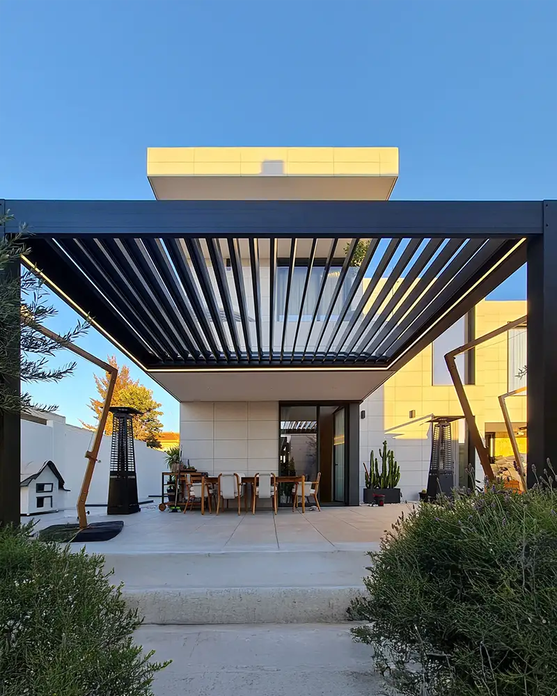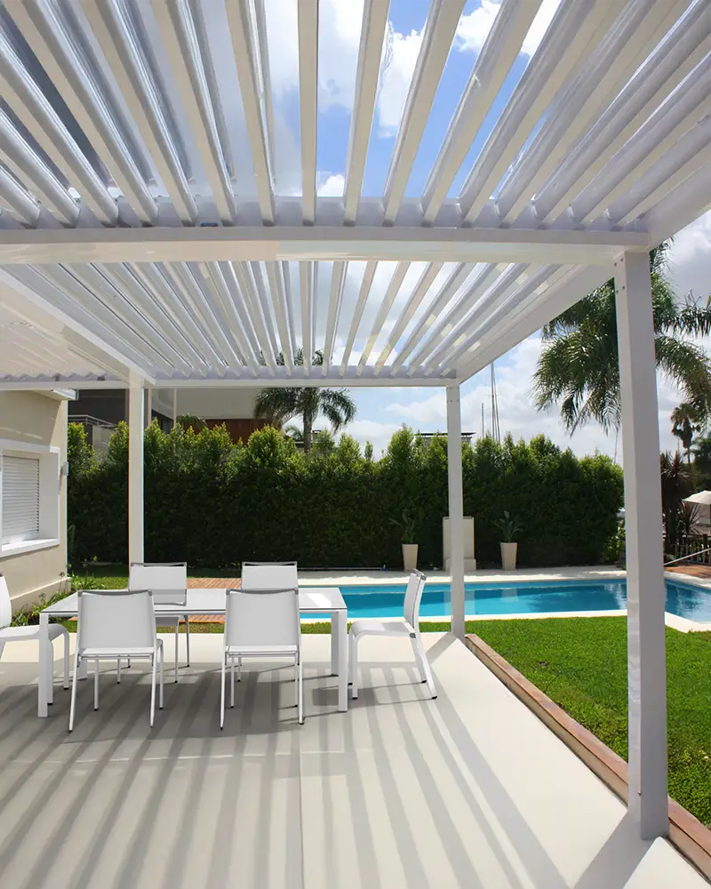 Gracias a la posibilidad de inclinar o abrir completamente las lamas, puedes disfrutar de una protección total contra el clima adverso o abrir el techo para dejar entrar el sol y el aire libre, según lo requiera el momento. Ideal para generar ambientes versátiles, tanto íntimos como sociales, en cualquier estación del año.