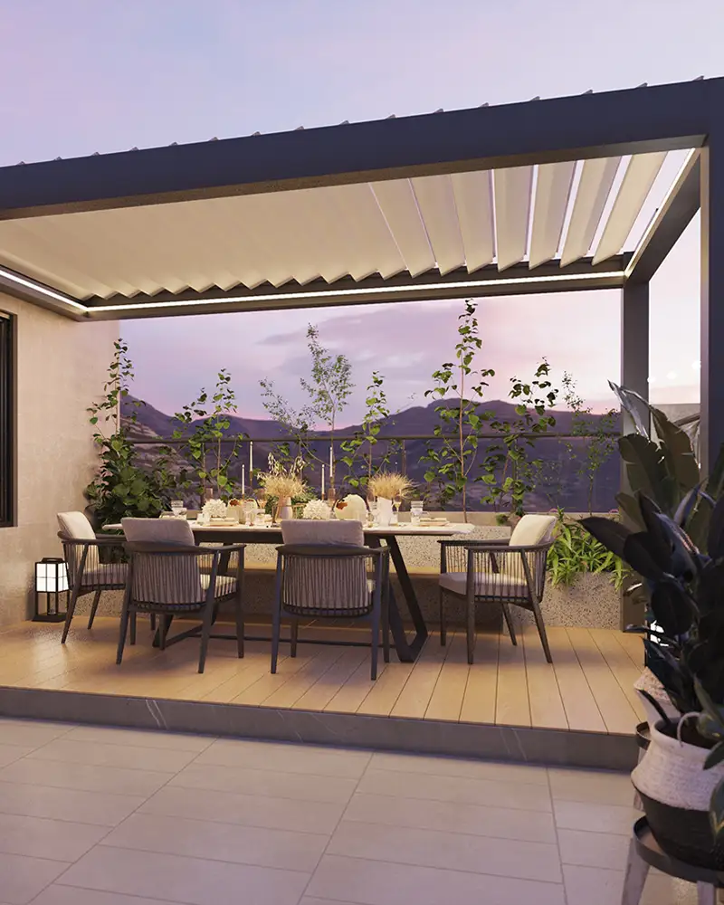 Con la inclinación mínima de 5° cuando está semi abierta, la pérgola garantiza ventilación óptima sin perder protección. Cuando está totalmente cerrada, ofrece un sellado eficiente contra lluvia, viento o sol intenso. Una solución 2-en-1 que combina la comodidad interior con la libertad del aire libre.