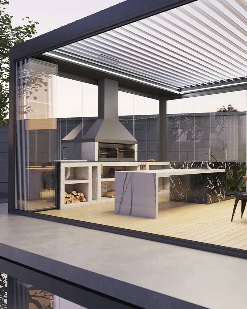 Gracias a su moderno sistema motorizado, la estructura permite inclinar las aspas de aluminio con total precisión, regulando flujo de aire y luminosidad ya sea mediante control fijo o desde tu smartphone o mando a distancia. También puedes abrir completamente el techo para disfrutar de cielos despejados y conexión total con el exterior.